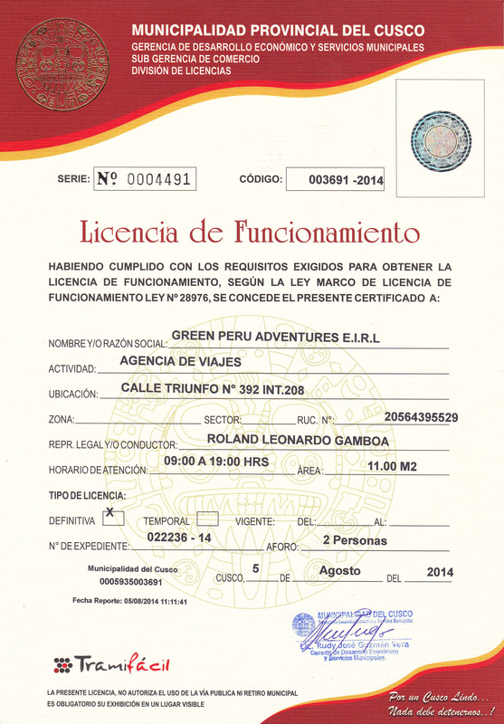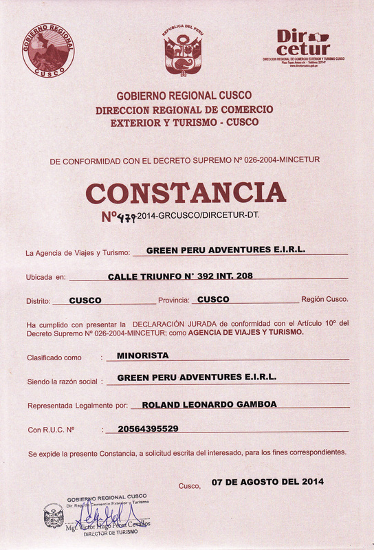 GREEN PERU ADVENTURES E.I.R.L is een officieel Peruaans bedrijf, geregistreerd onder het nummer RUC 20564395529 (onder de naam van Roland Leonardo Gamboa) adres: Calle Triunfo 392 Off. 208 Cusco. Om die reden zijn wij verplicht om de Peruaanse wettelijke beperkingen na te leven. Onze algemene voorwaarden zijn gebaseerd op de Peruaanse wetgeving.